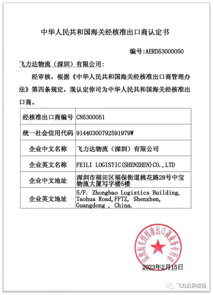 近日,飛力達(dá)旗下子公司飛力達(dá)物流(深圳)有限公司獲得由深圳海關(guān)頒發(fā)的《中華人民共和國海關(guān)經(jīng)核準(zhǔn)出口商認(rèn)定書 》。