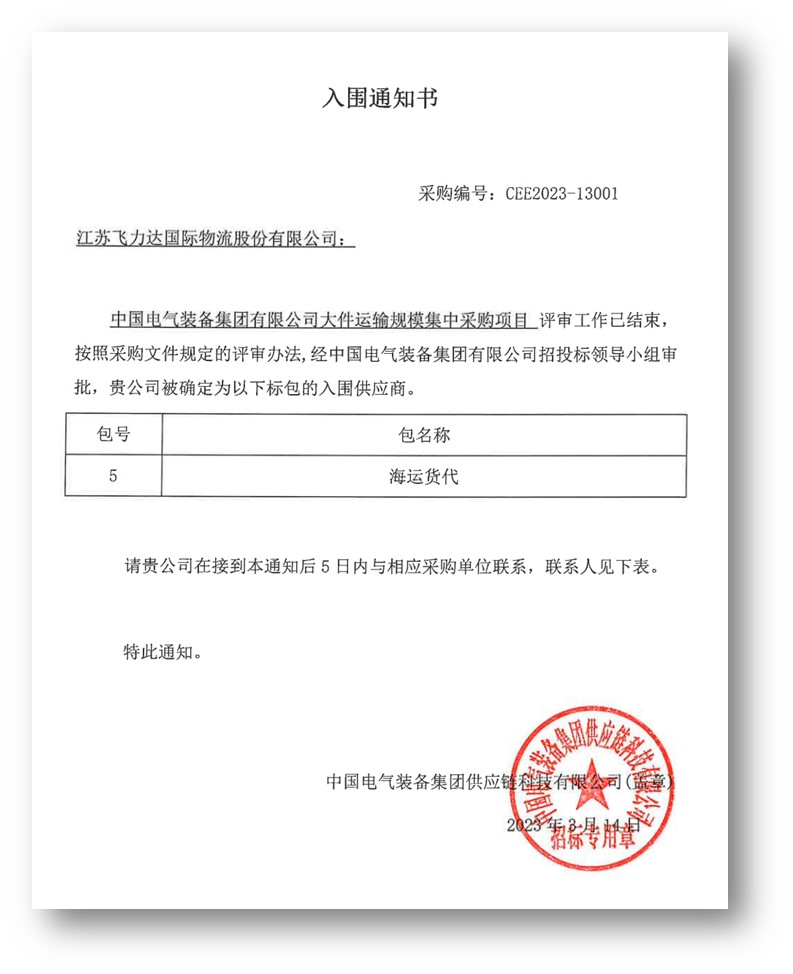 2023年3月14日,飛力達(dá)華南區(qū)收到中國(guó)電氣裝備集團(tuán)有限公司大件運(yùn)輸規(guī)模集中采購(gòu)項(xiàng)目入圍通知書,成功入圍中國(guó)電氣裝備集團(tuán)海運(yùn)貨代體系合格供應(yīng)商,這意味著飛力達(dá)可參與中國(guó)電氣裝備集團(tuán)及旗下包括山東電力、平高集團(tuán)、西安西電、許繼電氣等43家子公司海運(yùn)貨代業(yè)務(wù)的投標(biāo)運(yùn)營(yíng),標(biāo)志著飛力達(dá)在電氣裝備制造領(lǐng)域的又一重大突破。