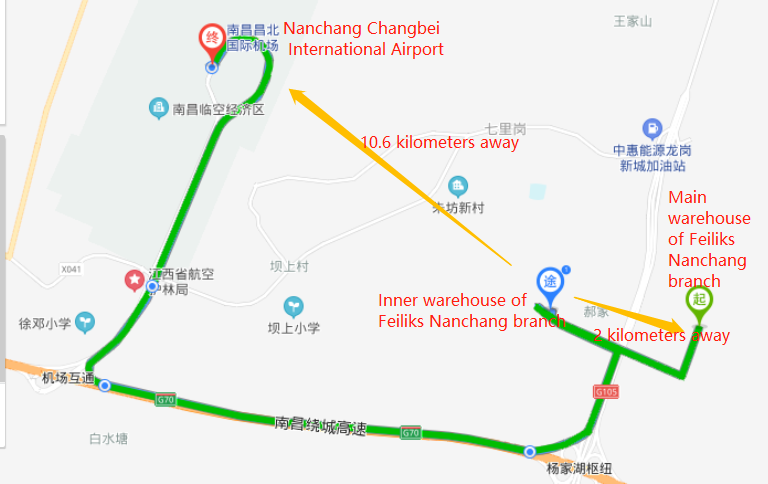 The warehouse outside Feiliks’ Nanchang Branch is located in the airport development zone of Ganjiang new area, Nanchang city. It is close to Nanchang Changbei Airport and the elevated hub of Ganjiang new area with the advantage of convenient transportation. The warehouse covers an area of 14,000 square meters, with shelf storage area, constant temperature and humidity warehouse, quality inspection room, reworking workshop and office area. The warehouse outside the branch is 2km away from Nanchang Comprehensive Bonded Zone, which effectively complements with the bonded warehouse in Feiliks Comprehensive Bonded Zone in terms of functions, and meets customers’ bonded and non-bonded business requirements at the same time.