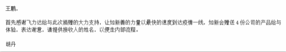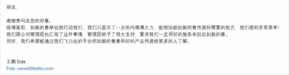 完成任務(wù)后,如新客戶特地發(fā)來致謝,這讓我們受寵若驚,同時(shí)為如新向“善”、 傳遞“善的力量”的企業(yè)文化所折服。隔離病毒,不隔離愛。同心戰(zhàn)“疫”,傳遞善的力量。