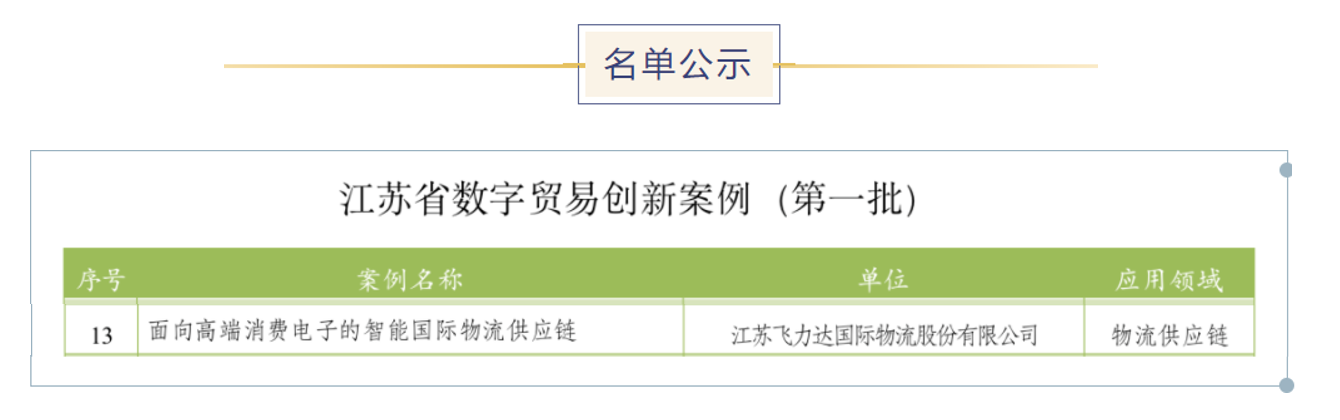 2023年1月3日,江蘇省商務(wù)廳發(fā)布了《江蘇省數(shù)字貿(mào)易創(chuàng)新案例 (第一批)》榜單。飛力達(dá)股份《面向高端消費(fèi)電子的智能國(guó)際物流供應(yīng)鏈》成功入選,成為15個(gè)創(chuàng)新性強(qiáng)、實(shí)踐效果好的入選優(yōu)秀案例之一。