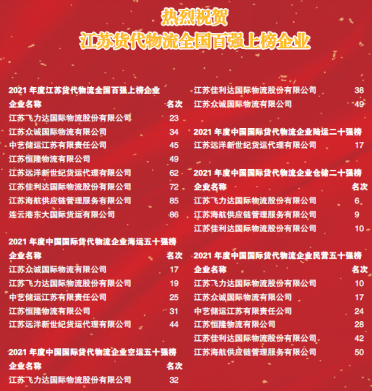 近日,中國(guó)國(guó)際貨運(yùn)代理協(xié)會(huì)權(quán)威發(fā)布2021年度中國(guó)貨代物流企業(yè)百?gòu)?qiáng)榜單,飛力達(dá)股份位列中國(guó)物流企業(yè)民營(yíng)第10名,再次躋身前列。