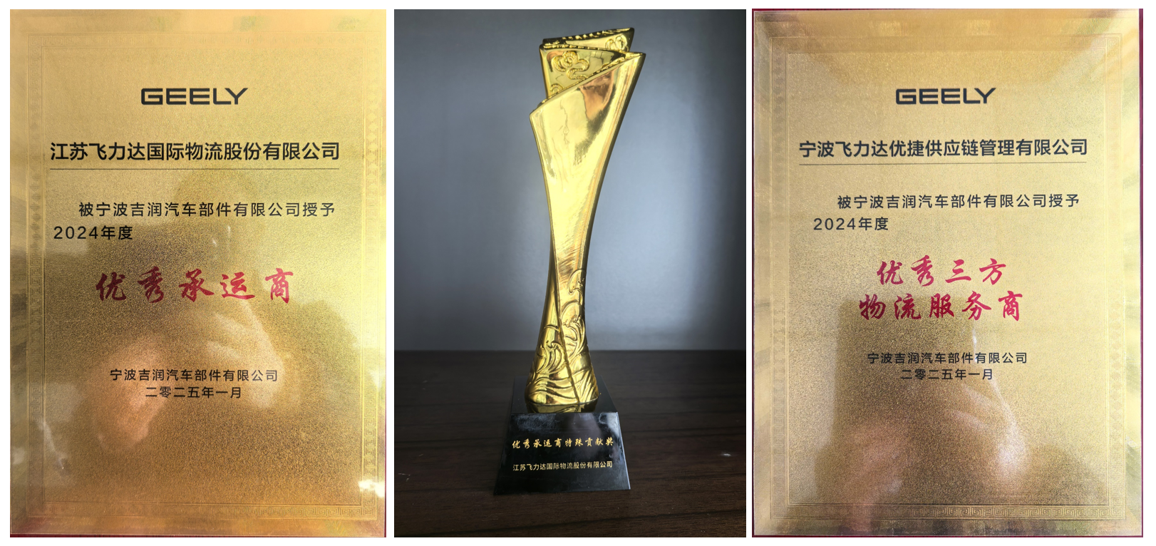 2025年1月,在這個充滿喜悅的新年伊始,飛力達及其旗下優(yōu)捷供應(yīng)鏈,憑借卓越表現(xiàn),贏得了吉利多個工廠的高度認可,榮獲 “優(yōu)秀承運商特別貢獻獎”“優(yōu)秀三方物流服務(wù)商” 等多個獎項 。
